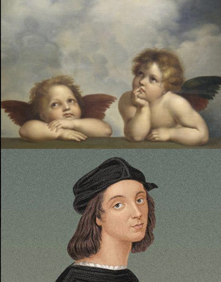 (西洋絵画で最も有名な天使画のひとつです。ここでは天使は古代のアモル(クピド)像にならい、翼を広げた裸の子どもとして描かれています。聖母マリアのモデルとなった女性の子どもを描いたという説もあるそうです)