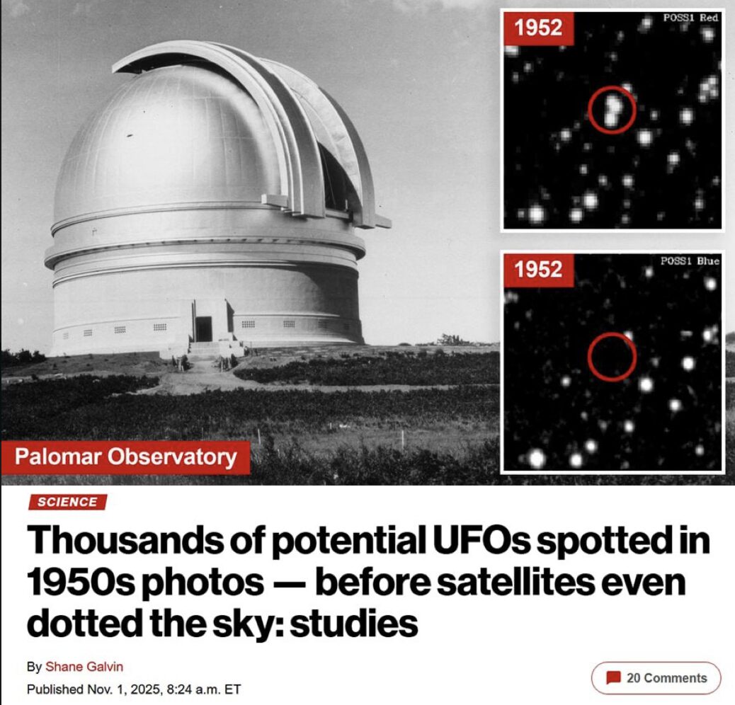 【写真左上はパロマー天文台、衛星が空に点在する前に、1950年代の写真で何千ものUFO可能性のあるものが発見されました。】