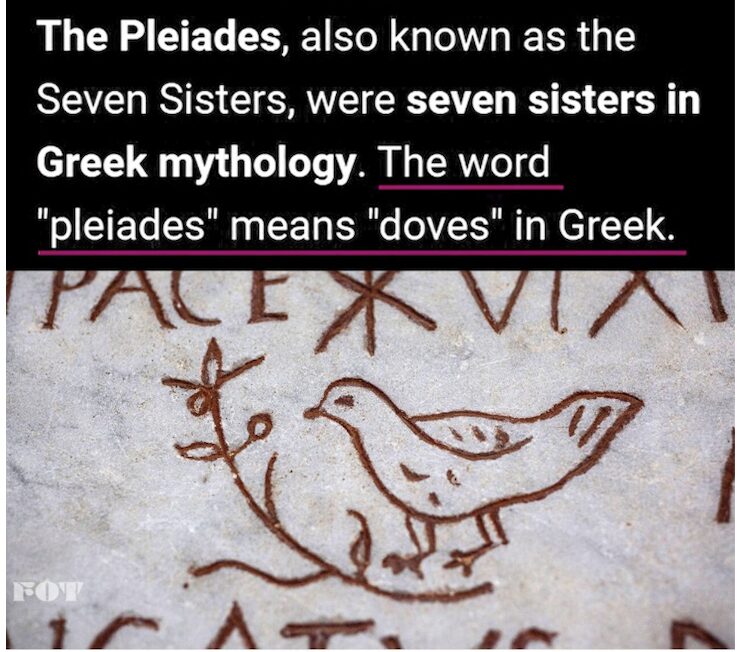 「プレアデスは、ギリシャ神話に登場する七人の姉妹です。「プレアデス」という言葉はギリシャ語で「鳩」を意味します。」